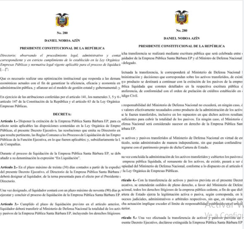 El presidente Daniel Noboa ordenó la extinción de la Empresa Pública Santa Bárbara EP, y dispuso que todos sus activos, pasivos y derechos litigiosos sean transferidos al Ministerio de Defensa Nacional. La liquidación deberá ejecutarse en un plazo máximo de 90 días, a cargo de un liquidador designado por el Directorio de la empresa. Una vez concluido el proceso, el Ministerio de Defensa administrará los bienes de forma independiente, sin que se integren a su patrimonio institucional, y será responsable de cubrir los pasivos con los recursos generados de dicha administración.