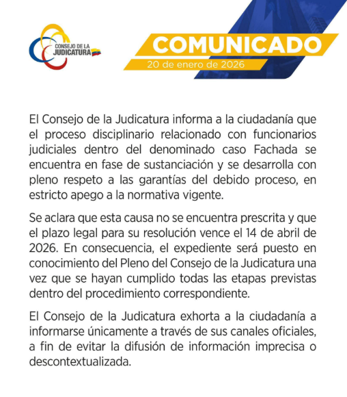 Sobre el proceso disciplinario contra funcionarios judiciales en el #CasoFachada, el Consejo de la Judicatura informa que se encuentra en fase de sustanciación y se desarrolla con pleno respeto a las garantías del debido proceso.