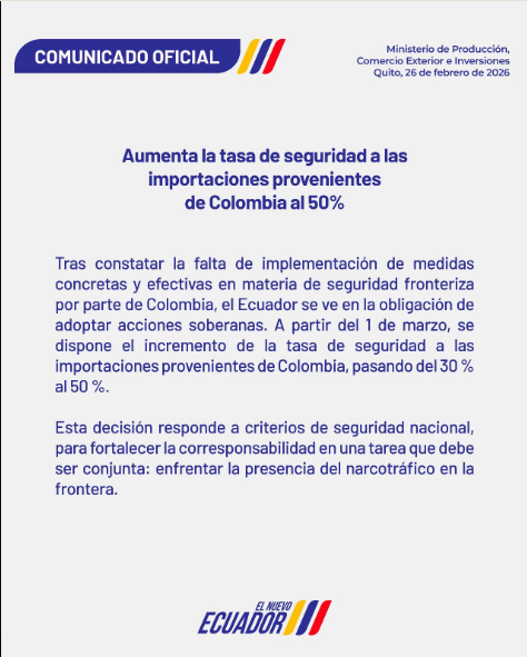 El Gobierno Nacional anunció que, desde el 1 de marzo de 2026, la tasa de seguridad aplicada a las importaciones provenientes de Colombia aumentará del 30% al 50%.