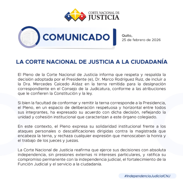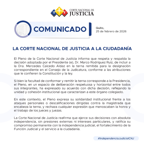 El Pleno de la Corte Nacional de Justicia respaldó la decisión del presidente encargado del organismo, Marco Rodríguez, de incluir a la magistrada Mercedes Caicedo Aldaz en la terna remitida para la designación correspondiente en el Consejo de la Judicatura.