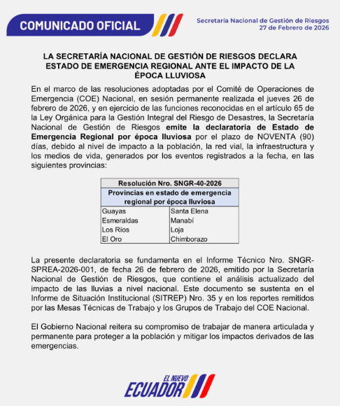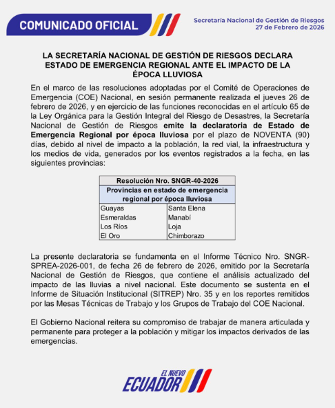 La medida fue adoptada tras acoger el informe técnico de la Secretaría Nacional de Gestión de Riesgos, que evidenció el impacto acumulado de las lluvias en la población, la red vial y los medios de vida