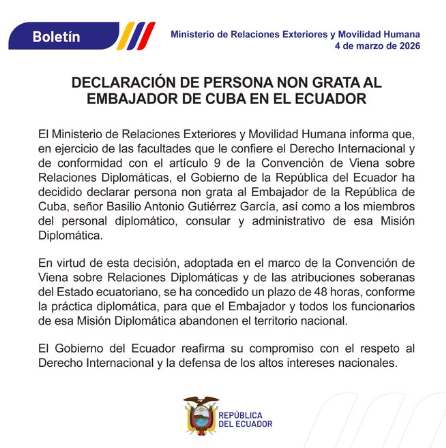 El Gobierno Nacional declaró persona “non grata” al embajador de Cuba, Basilio Antonio Gutiérrez García, y otorgó un plazo de 48 horas para que abandone el país junto con toda la misión diplomática de la isla acreditada en territorio ecuatoriano, confirmó la Cancillería en un comunicado.